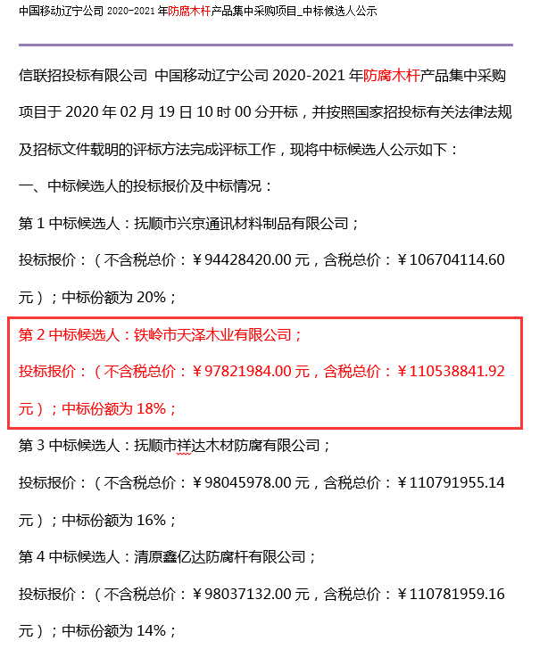 天澤木業(yè)在中國移動遼寧公司最新防腐木桿采購項(xiàng)目中中標(biāo)